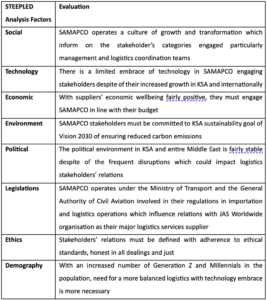 In summary of the Porter’s 5 forces analysis, SAMAPCO capitalise on the low bargaining power amongst the logistic services supplier (JAS Worldwide). This represent a significant advantage in negotiation plan. Also, for new entrants, a significant amount of time would mean optimum resources use in sourcing of the logistic services. This is with high competitive rivalry affecting ability to leverage on value for money outcomes and increasing overall loyalty, how experienced they are and capital-based investments. Part of this assessment recommendation would include setting priorty to leverage on bargaining power of their buyers by continuously switching to different stakeholders  and effectively managing different market suppliers.