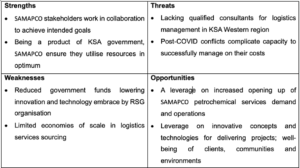 Starting with internal analysis, this tool focuses on strengths, weaknesses, opportuntiies and threats (CIPS, 2022). In this context, the SWOT analysis is appropriate for  SAMAPCO as part of sourcing for logistics services spend category. A summary of the analysis is illustrated in the following;