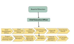 ROSHN’s organisational structure is people-centred, with clear reporting relationships to support strategic coordination of its nationwide developments (Brand Finance, 2025). At the top, there are the Board of Directors who provide governance and give direction. The Chief Executive Officer leads the organisation and is supported by an executive leadership team made up of Chief Officers in the areas of Development, Construction, Commercial, Supply Chain, Finance, Human Resources and Digital Transformation. Each Chief Officer is in charge of teams of directors, managers and specialists who translate strategic objectives into operational delivery (See Figure 1).
