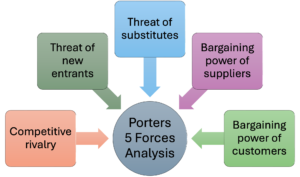 Porters Five Forces refers to a strategy analysis tool which analyses the competitive pressure in any given industry through the five forces which are competitive rivalry, threat of new entrants, threat of substitutes, bargaining power of suppliers, and bargaining power of customers (Gratton, 2025).